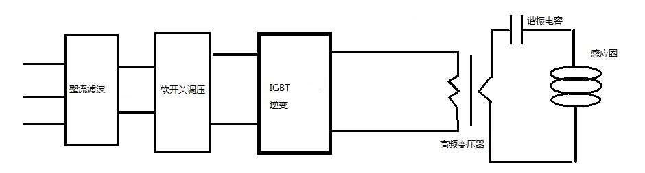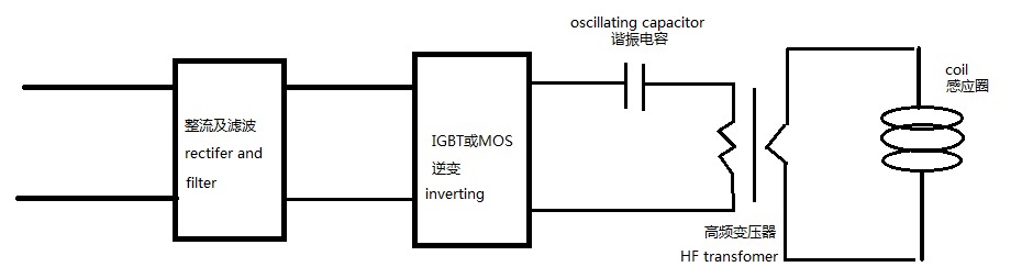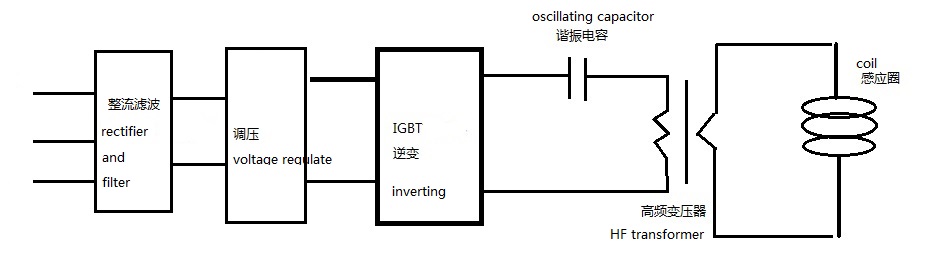 In these machines, series oscillating circuit is applied, through high frequency transformer, low voltage and high current power is output to go through the induction coil.